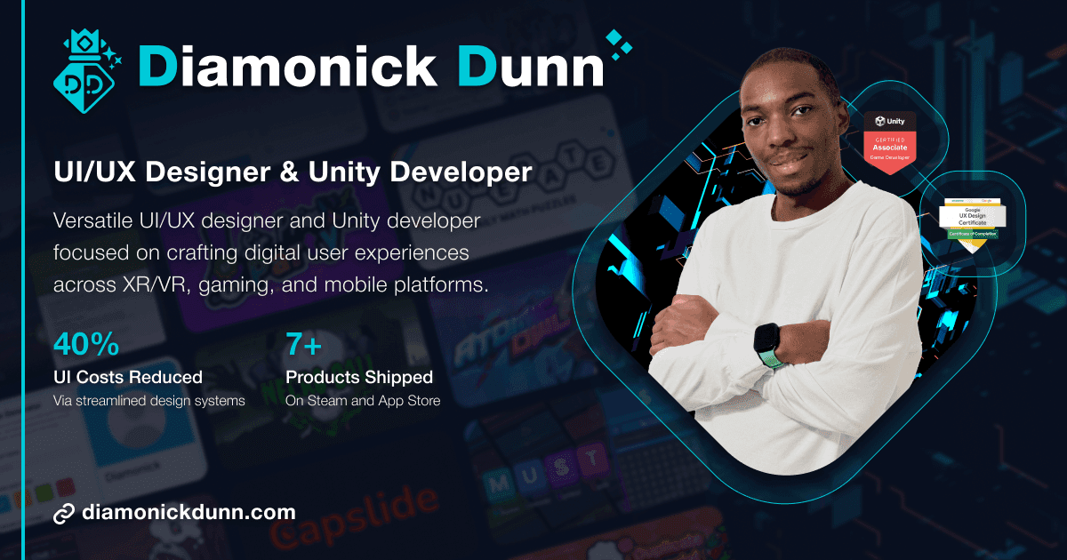 Hi!👋 I’m Diamonick Dunn, a UI/UX Designer 🖥️ and Unity Developer 🎮 and with 6+ years of professional experience residing in Baton Rouge, LA. I specialize in developing a variety of different games/apps (2D, 3D, mobile, VR) in the Unity engine and designing clean user interfaces using Adobe Photoshop, Adobe Illustrator, and Figma. I also published 3 Unity Editor tools🛠️ to the Unity Asset Store and shipped 2 mobile apps📱 to the App Store as a solo Unity developer. I also like to do graphic design, level design, front-end development, vector art, and VFX.